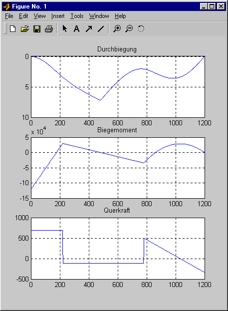 ('Biegemoment') % Momentenverlauf subplot (3,1,3) ; plot (z , FQ(3:n-2)) , grid on , title ('Querkraft') % Querkraftverlauf