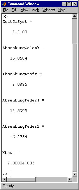 AbsenkungKraft = v(iF) % Ausgabe in das Command window: AbsenkungFeder1 = v(ic1) % Zahlenwerte der Verschiebungen ...