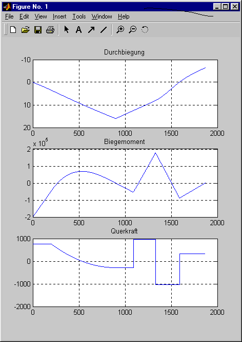 subplot (3,1,2) ; plot (z , Mb(3:n-2)) , grid on , title ('Biegemoment') subplot (3,1,3) ; plot (z , FQ(3:n-2)) , grid on , title ('Querkraft') AbsenkungGelenk = v(iG)
