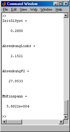 subplot (2,1,2) ; plot (z , Mb(3:n-2)) , grid on , title ('Biegemoment') AbsenkungLinks = v(3) % Ausgabe in das Command window: