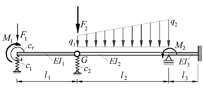 eine veränderliche Linienlast, eine Einzelkraft und ein Einzelmoment belastet, schließlich sind ein Gelenk, eine weitere Feder und eine Zwischenstütze zu berücksichtigen.