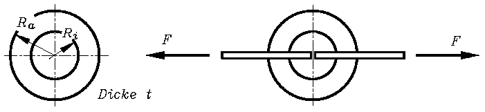 Gegeben: F = 1000 N ; Ra = 62 mm ; Ri = 42 mm ; t = 5 mm ;