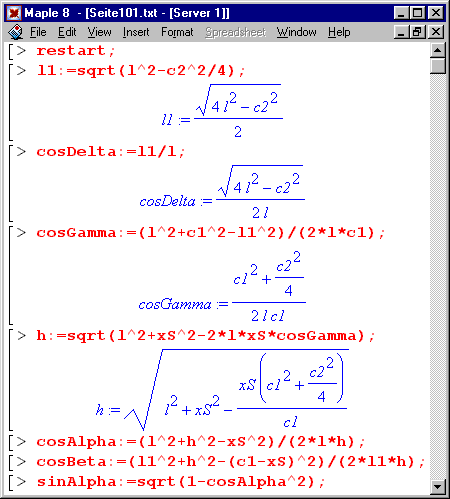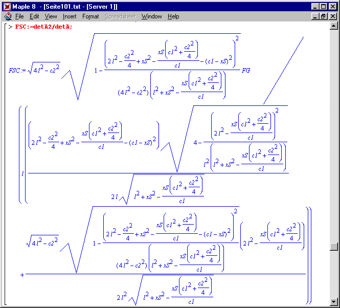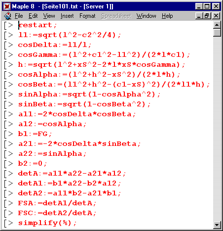 verwenden. Mit der nebenstehend zu sehenden Liste von Maple-Kommandozeilen wird dies demonstriert, indem zunächst der komplette Formelsatz eingegeben wurde.