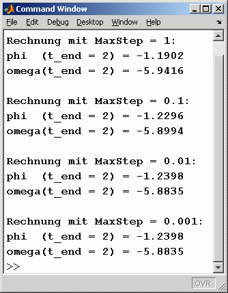 Zu diesem Script: Das Setzen der MaxStep-Option ist (wie bei fast allen Anfangswertproblemen der Technischen Mechanik) zwingend, weil die Standardeinstellung keine ausreichende Genauigkeit bringt. Welcher Wert dafür einzusetzen ist, wird durch Mehrfachrechnung ausprobiert. Dafür werden die Endwerte für φ und ω in das Command Window ausgegeben und für die unterschiedlichen Rechnungen verglichen. Nachfolgend sieht man links die Graphik-Ausgabe des Scripts und rechts die Werte im Command Window für insgesamt vier Rechnungen. Man erkennt, dass die Standardeinstellung (MaxSteP = 1) nicht ausreichend ist, mit MaxSteP = 0,01 erhält man Ergebnisse, die sich bei noch kleineren Werten nicht mehr ändern: