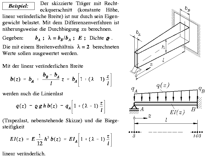 Dieser Wert kann mit der exakten Biegelinie (Seite 270) verglichen werden. Mit einer Abweichung von deutlich weniger als 0,2% vom exakten Wert ist der mit dem Differenzenverfahren bei der gewählten