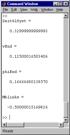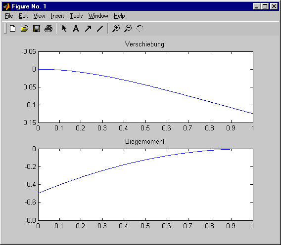Nach der Lösung des Gleichungssystems werden mit den Zeilen, die nicht mit einem Semikolon abgeschlossen sind, neben der für die Lösung verbrauchten Zeit drei Ergebnisse in das "Command Window" ausgegeben: Verschiebung am Trägerende und der Biegewinkel an dieser Stelle, der mit Hilfe der Differenzenformel für die erste Ableitung aus den Verschiebungen der beiden Nachbarpunkte berechnet wird, sowie das auf entsprechende Weise mit der Näherung der zweiten Ableitung berechnete Biegemoment an der Einspannung. Schließlich wird in einer Schleife der gesamte Biegemomentenverlauf berechnet, und Durchbiegung und Biegemomentenverlauf werden in ein Graphik-Fenster gezeichnet. Für die oben gelistete Datei (mit nA = 1000, Gleichungssystem mit 1005 Gleichungen) sehen nach der Berechnng das "Command Window" und das Graphik-Fenster so aus: