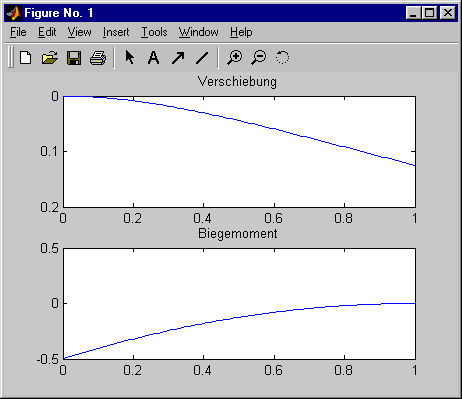 Nach der Lösung des Gleichungssystems werden mit den Zeilen, die nicht mit einem Semikolon abgeschlossen sind, drei Ergebnisse in das "Command Window" ausgegeben: Verschiebung am Trägerende und der Biegewinkel an dieser Stelle, der mit Hilfe der Differenzenformel für die erste Ableitung aus den Verschiebungen der beiden Nachbarpunkte berechnet wird, sowie das auf entsprechende Weise mit der Näherung der zweiten Ableitung berechnete Biegemoment an der Einspannung. Schließlich wird in einer Schleife der gesamte Biegemomentenverlauf berechnet, und Durchbiegung und Biegemomentenverlauf werden in ein Graphik-Fenster gezeichnet. Für die oben gelistete Datei (mit nA = 100) sehen nach der Berechnng das "Command Window" und das Graphik-Fenster so aus: