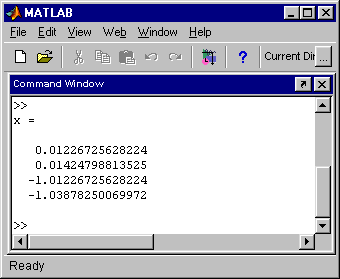 Das lineare Gleichungssystems wird in der Zeile x = A \ b gelöst. Weil diese Zeile nicht mit einem Semikolon abgeschlossen ist, wird das Ergebnis in das “Command Window” geschrieben (nebenstehende Abbildung). |
