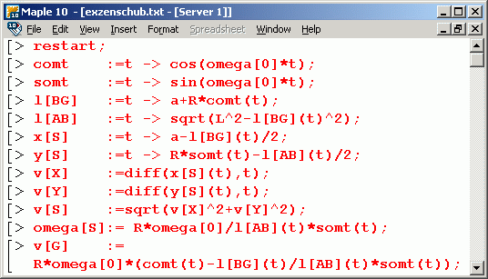 Neben den Formeln ist das Maple-Script für diesen Formelsatz zu sehen (zum Download verfügbar als exzenschub.mws). Weil Maple symbolisch rechnet, kann er ausgewertet werden, ohne Zahlenwerte für die gegebenen Größen vorzugeben. Nachstehend wird die Ausgabe nach Abarbeitung der drei letzten Zeilen gezeigt: