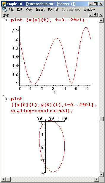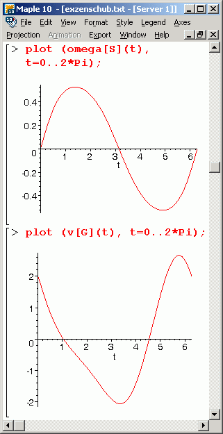 Für die graphische Darstellung der Funktionen werden Zahlenwerte für die gegebenen Größen benötigt. Wie im Kapitel "Kinematik starrer Körper" werden die Abmessungsverhältnisse R/a = 2 und l/a = 4 angenommen, um die nachfolgenden Graphiken zu erstellen. Links sieht man die Funktionen ωS(t) und vG(t), rechts vS(t) und die Bahnkurve des Mittelpunkts der Verbindungsstange. Zwischen den beiden Bildern mit den Maple-Graphiken sieht man eine Animation der Bewegung.