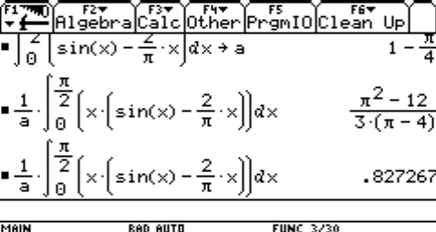 In der ersten Zeile des nebenstehenden Schnappschusses des Displays ist das Ergebnis der gerade beschriebenen Berechnung zu sehen. In der zweiten und dritten Zeile findet man die Ergebnisse für die Berechnung von xS. Weil die Integrale in geschlossener Form lösbar sind, kann die Fähigkeit des TI 92 zur symbolischen Rechnung genutzt werden (zu sehen in den ersten beiden Zeilen). In der letzten Zeile ist der numerische Wert des Ausdrucks (Grüne Raute-Taste und dann Enter), der in der zweiten Zeile berechnet wurde, zu sehen. |