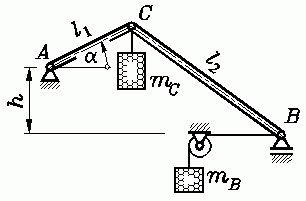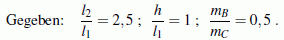 Zwei Stäbe mit den Längen l1 und l2, deren Eigengewicht zu vernachlässigen ist, sind wie skizziert gelagert und durch die Gewichtskräfte der Massen mB und mC belastet.