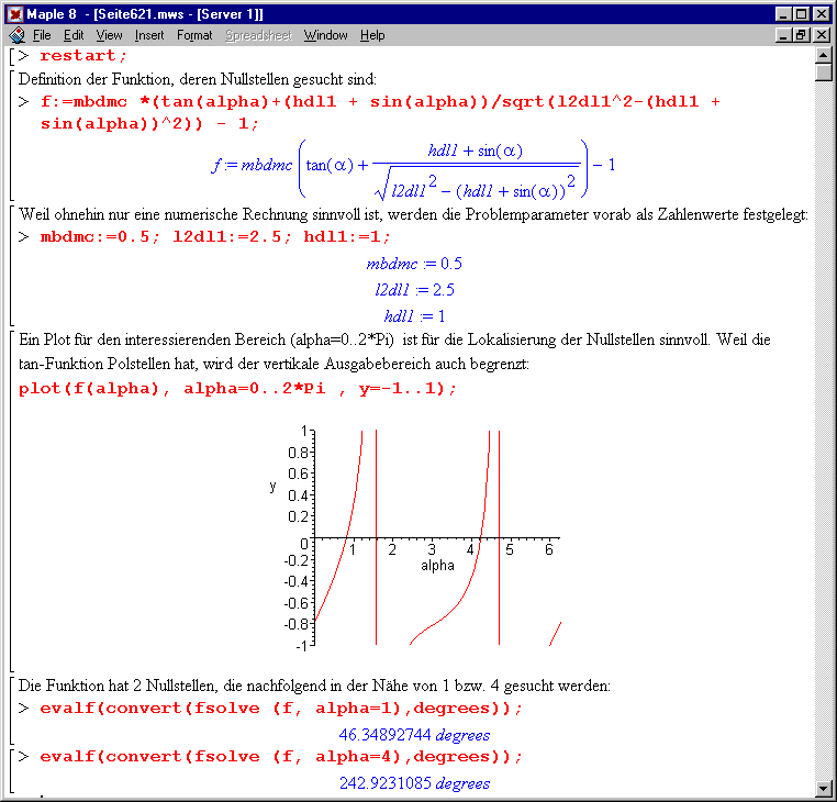 erfüllt ist. Es sind also die Nullstellen der Funktion f(α) gesucht. Dies ist nur numerisch möglich und wird nachfolgend mit dem Mathematik-Programm Maple erledigt.