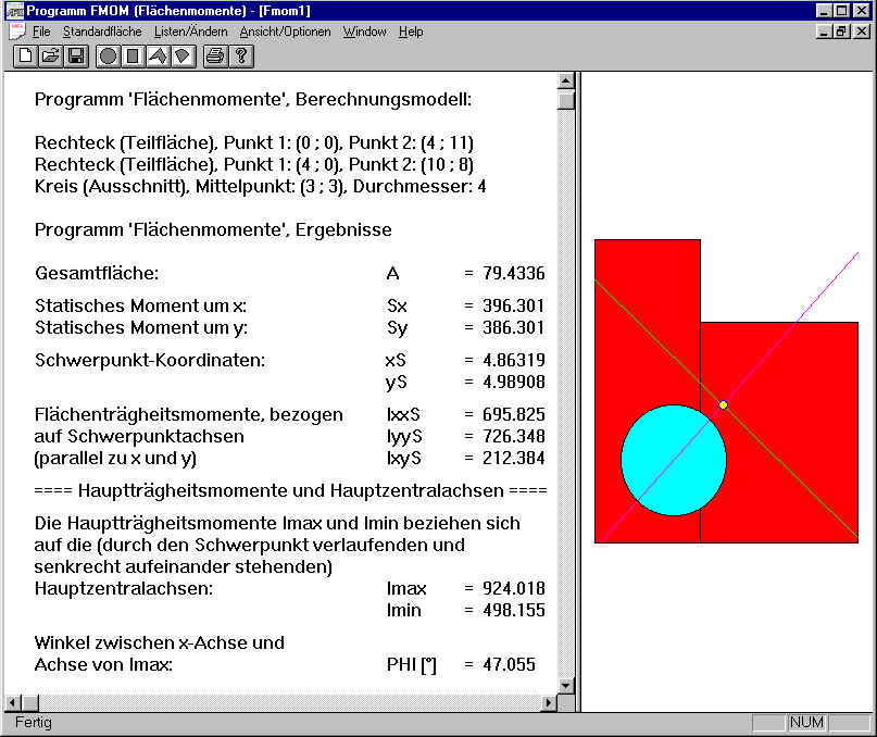 Der nachfolgende Bildschirm-Schnappschuss ist das Ergebnis der Berechnung mit dem Programm FMOM. Die Fläche wurde in zwei Rechtecke unterteilt, aus der ein Kreis ausgeschnitten wird. |