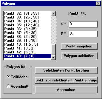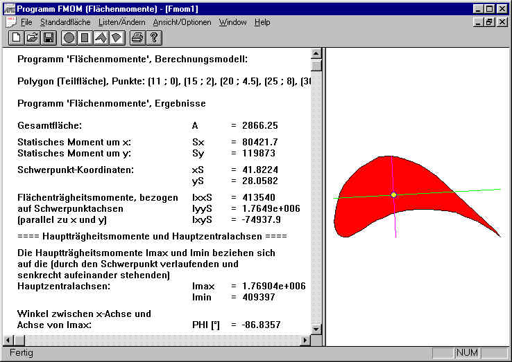 Der nachfolgende Bildschirm-Schnappschuss zeigt das Ergebnis der Berechnung einer Turbinenschaufel mit dem Programm FMOM. Die Fläche wurde als Polygon mit insgesamt 43 Punkten genähert (das Bild rechts zeigt das Eingabefenster für Polygone unmittelbar vor der Auswahl “Polygon schließen”). |