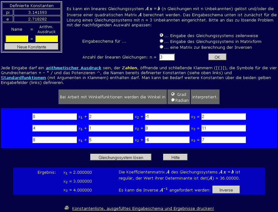 Variante a: Unter "TM-interaktiv" findet man das Programm "Lineares Gleichungssystem, Matrixinversion". Nach dem Start des Programms im Browser sieht man, dass das System mit drei Unbekannten genau in das Eingabeschema passt, das beim Start des Programms erscheint. Es wird gelöst, indem man zunächst die Zahlenwerte des Gleichungssystems a in das Schema einträgt (Tipp: Eingabe eines Wertes mit der Tab-Taste lässt den Cursor in das jeweils nächste Feld springen). Wenn die Eingabe komplett ist, wird der Button "Gleichungssystem lösen" angeklickt, und das Ergebnis wird angezeigt. Nachfolgend sieht man einen Bildschirm-Schnappschuss mit dem ausgefüllten Eingabeschema und dem Ergebnis der Rechnung: