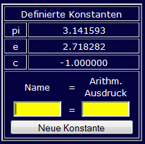 Wenn vorab der Konstanten c ein Wert zugewiesen worden wäre (nebenstehendes Fenster), dann könnte c für die Eingabe verwendet werden. Dann wären sogar arithmetische Ausdrücke wie 5*c+sin(pi/4) erlaubt.