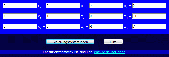 Variante b: Im Eingabeschema braucht nur ein Wert modifiziert zu werden. In der ersten Zeile wird der Koeffizient vor x3 von −1 auf −4 geändert. Nach Anklicken des Buttons "Gleichungssystem lösen" erscheint in diesem Fall kein Ergebnis: