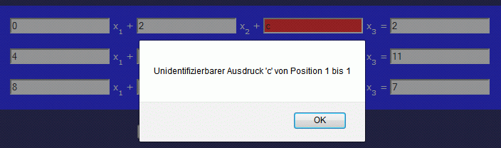 Variante c: Im Eingabeschema wird in der ersten Zeile der Koeffizient vor x3 durch das Symbol c ersetzt. Die Reaktion ist eine Fehlermeldung: