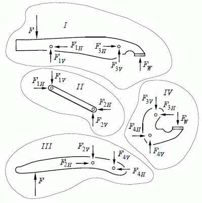 Die darunter dargestellten Schnittskizzen als Vorbereitung für die Computerrechnung (siehe Beispiel im Kapitel "Ebene Systeme starrer Körper" in "Dankert/Dankert: Technische Mechanik") legen das Aufschreiben von 12 Gleichgewichtsbedingungen nahe (3 je Teilsystem), denen aber nur 9 Unbekannte gegenüberstehen. Welche Gleichgewichtsbedingungen nicht verwendet werden sollen, ist nicht ganz einfach zu entscheiden. Auf der Seite "Gripzange, Lösung mit 9 Gleichgewichtsbedingungen" wird das Problem behandelt und jeweils eine inkorrekte Auswahl (führt zu Singularität) und eine korrekte Auswahl verwendet.