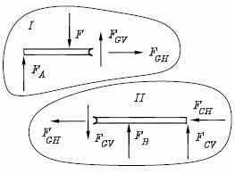 Für das nebenstehend skizzierte System können am Gesamtsystem (nur die drei Lager A, B und C werden weggeschnitten und durch 4 Lagerkraftkomponenten ersetzt) und an an den Teilsystemen I und II beliebig viele Gleichgewichtsbedingungen formuliert werden, von denen 6 für die Berechnung der 6 Unbekannten benötigt werden.