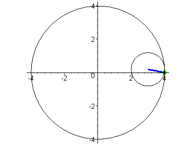 Für den Spezialfall a/r = 1 (Punkt A auf dem Umfang des rollenden Kreises) hat Prof. Dr. Bernd Baumann (HAW Hamburg) mit dem Programm “Maple” eine Animation erstellt, die das Entstehen dieser sogenannten “Spitzen Epizykloide” (nachfolgendes Bild links) beim Abrollen eines Kreises auf einem anderen Kreis zeigt. Vom selben Autor stammt die Animation, die das Entstehen einer “Spitzen Hypozykloide” beim Abrollen eines Kreises in einem anderen Kreis zeigt (rechtes Bild). |