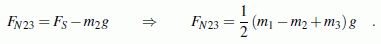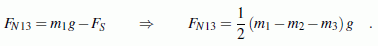 Diese Regeln wurden bei der hier demonstrierten Rechnung strikt eingehalten. Das Ergebnis für die Seilkraft ist in jedem Fall positiv. Die Ergebnisse für die beiden Kräfte FN13 und FN23 jedoch nur, wenn der in der Klammer stehende Ausdruck nicht negativ wird. Kritisch ist die Stelle zwischen den Massen m1 und m3. Die Kraft FN13 zwischen diesen Massen ist nur positiv, wenn