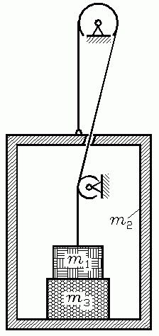 Über zwei feste drehbare Rollen verbindet ein Seil die Massen m1 und m2. Zwischen beiden Massen befindet sich ein Körper mit der Masse m3. Die Masse des Seils kann vernachlässigt werden.
