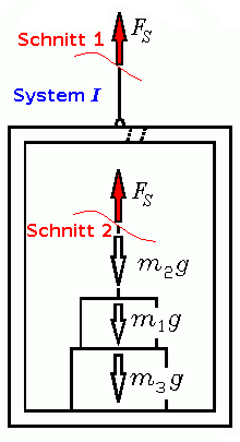 Man beachte: Die zwischen den Massen wirkenden Kräfte sind in diese Rechnung nicht eingegangen. Weil sie dort paarweise (gleich groß und entgegengesetzt gerichtet) wirken, heben sich ihre Wirkungen auf. Erst durch einen Schnitt werden die paarweise wirkenden Kräfte jeweils einem Teilsystem zugeordnet und gehen in die Gleichgewichtsbetrachtungen des Teilsystems ein.