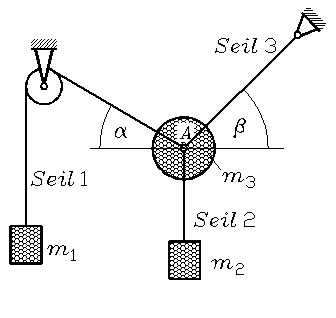 Der Punkt A wird durch die Gewichtskräfte der drei Massen m1, m2 und m3 belastet (die Seilmassen dürfen vernachlässigt werden).