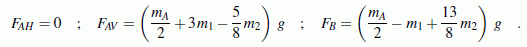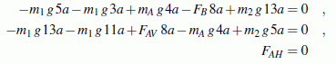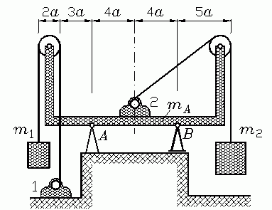 Eine Arbeitsbühne mit der Masse mA (einschließlich der Seilwinde 2 und der beiden Umlenkrollen) ist durch die beiden von den Seilwinden 1 und 2 gehobenen Massen m1 und m2 belastet. Die Gewichtskraft der Masse mA wirkt auf der eingezeichneten Mittellinie. Die Masse der Seile kann vernachlässigt werden.