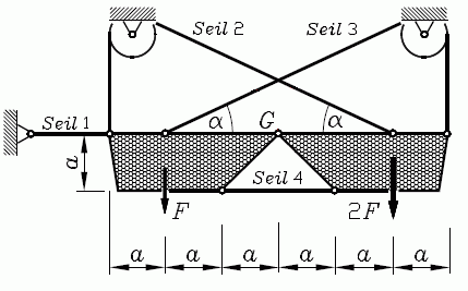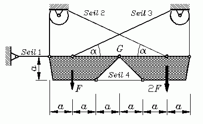 Zwei starre Körper sind über ein Gelenk G und das Seil 4 miteinander verbunden. Sie sind durch die Kräfte F bzw. 2F belastet und werden von den Seilen 1 bis 3 gehalten. Zu berechnen sind die Seilkräfte.