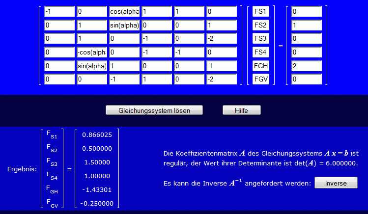 Das Gleichungssystem kann zum Beispiel mit dem Programm "Lineares Gleichungssystem, Matrixinversion" gelöst werden. Nachfolgend sieht man den Bildschirmschnappschuss mit Eingabebereich und Ergebnis: