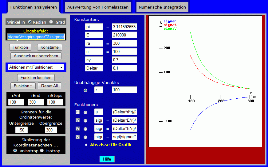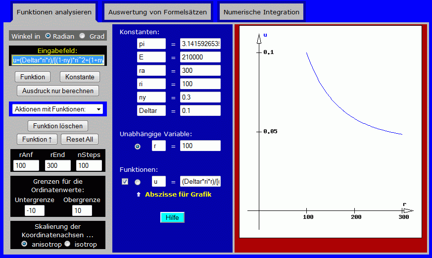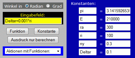 Nach dem Start des Programms "Funktionen analysieren" (zu finden unter "Ingenieurmathematik und Technische Mechanik interaktiv") werden zunächst die gegebenen Größen als Konstanten definiert (in das gelbe Feld links oben eingeben, z. B. so: ri=100 und mit Klick auf den Button "Konstante" abschließen).
