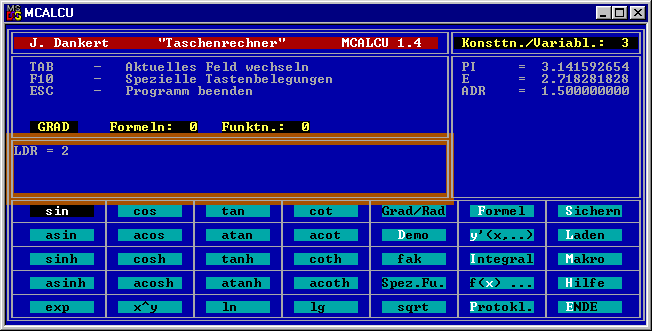 Der nachfolgende Bildschirm-Schnappschuss zeigt den Startbildschirm des “Taschenrechners” mit dem bereits im Konsttn./Variabln.-Speicher zu sehenden Wert für ADR unmittelbar vor