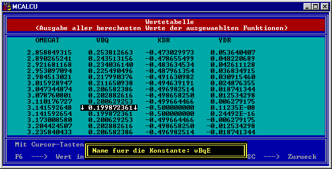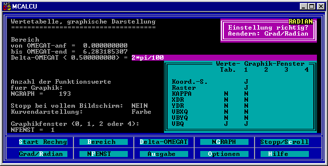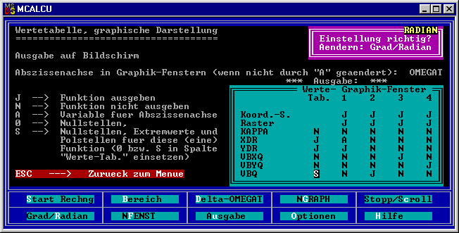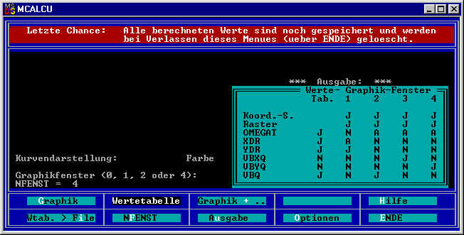 Nach Rückkehr zur Ansicht “Alle Fenster” wird durch Drücken der ESC-Taste die Graphik verlassen, es erscheint das Angebot, mit dem man auf die berechneten Wertetabellen zugreifen