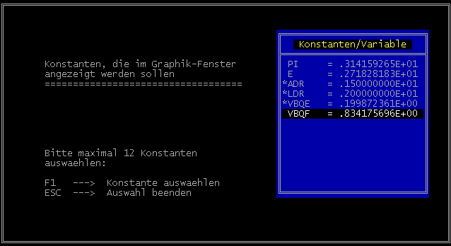 geforderten Ergebnisse auf einem Bildschirm zu erzeugen. Es erscheint folgendes Angebot, in dem durch jeweiliges Drücken der Funktionstaste <F1> schon 3 Werte für die nachfolgende Anzeige im “Graphik +