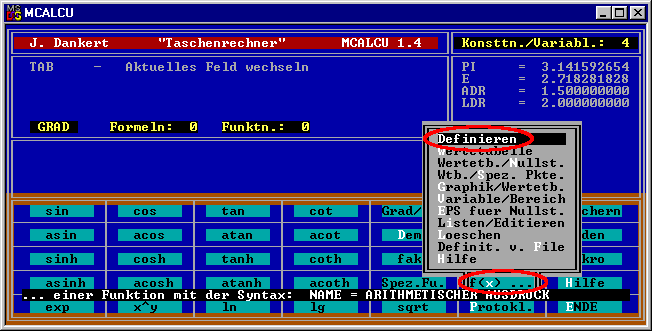 Im “Tastaturmenü” wird (am einfachsten mit der Maus) erst f(x) ... und im sich öffnenden Submenü wird Definieren gewählt: