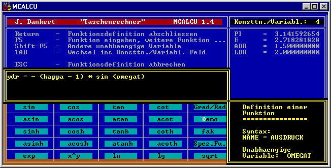 - Durch Auswahl des Angebots “Grad/Radian” wurde die Interpretation der Argumente der Winkelfunktionen auf “Radian” umgestellt (wird rechts oben angezeigt).