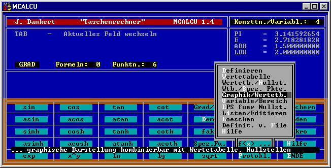 Mit “ESC” verlässt man die Wertetabelle. Es erscheint wieder das vorab verlassene Menü, in dem nun noch “Graphik + ..” gewählt werden sollte, um eine Zusammenstellung aller