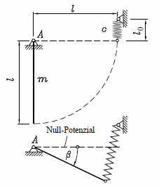 Eine Stange der Länge l mit der Masse m wird wie skizziert in eine Feder eingehängt, die im entspannten Zustand die Länge l0 hat. Es sind alle möglichen Gleichgewichtslagen zu bestimmen, wobei zwischen stabilen und instabilen Lagen zu unterscheiden ist. Gegeben: