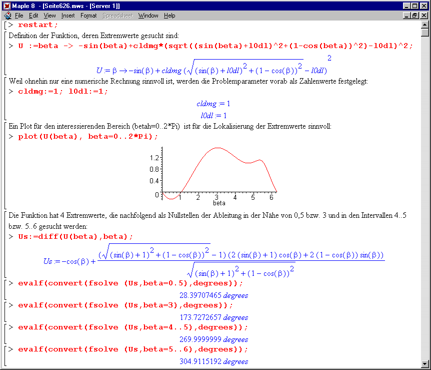 Das nachfolgend zu sehende "Maple Worksheet" (zum Download verfügbar als GgwLagenBsp2.mws) realisiert folgende Berechnungsstrategie: Zunächst wird die Funktion U(β) grafisch dargestellt, um einen Überblick über die Lage der Extremwerte zu bekommen. Weil Maple symbolisch rechnen kann, wird die Funktion danach differenziert. Die Nullstellen der Funktion U ' (β) werden numerisch bestimmt: