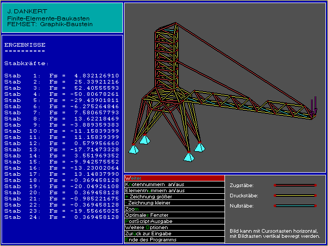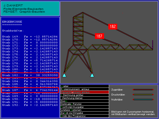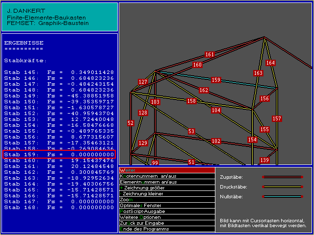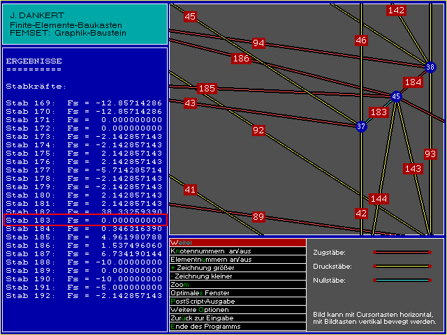 Nach mehrmaliger Wahl von “Weiter” (oder Drücken von ESC) erscheint die Liste der Stabkräfte mit der graphischen Darstellung der Zug-, Druck- und Nullstäbe: