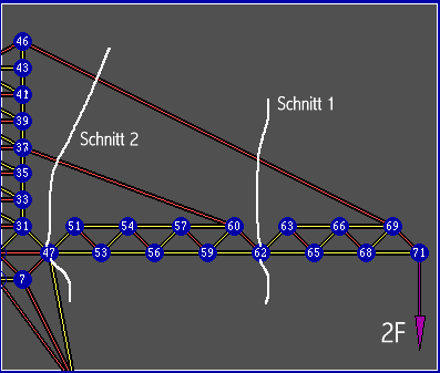 Mit der dann bekannten Kraft im oberen Seil kann mit einem “Schnitt 2” aus dem Momenten-Gleichgewicht um den Knoten 47 die Kraft im unteren Seil berechnet werden.