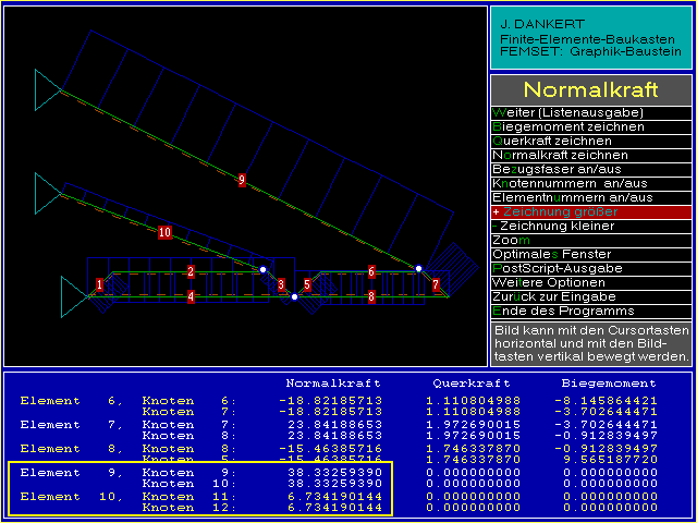 Das nebenstehende Bild zeigt das Ergebnis der Berechnung, von dem natürlich nur die Schnittgrößen in den Elementen 9 und 10 interessieren. Dass selbstverständlich keine