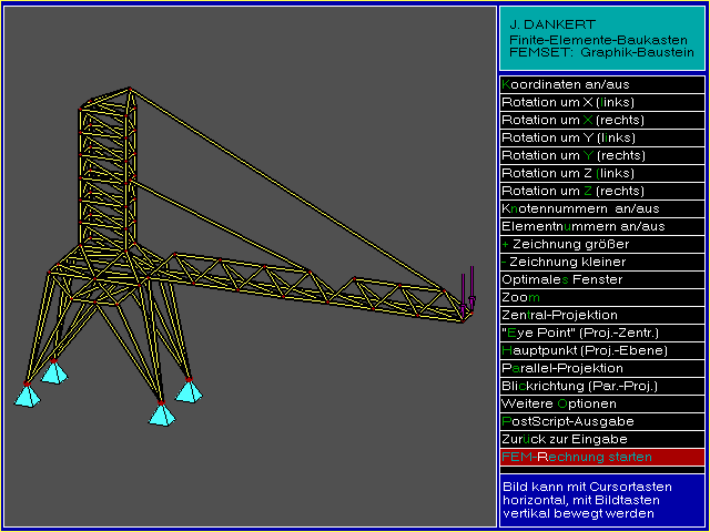 Wenn das Eingabemodell (über Tastatur-Eingabe oder Einlesen einer Datei) komplett ist, kann “FEM-Rechnung starten” gewählt werden, danach sollte der Bildschirm folgendermaßen