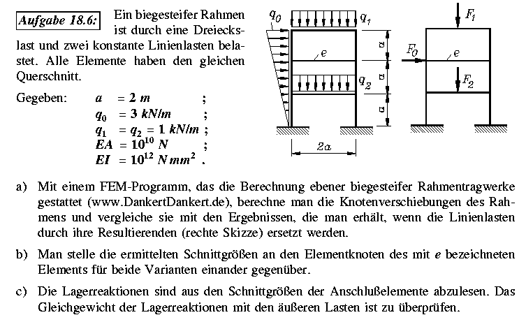 Bei den Element-Parametern sind Dehnsteifigkeit EA (Dimension: N) ond Biegesteifigkeit EI (Dimension: Nmm2) für alle Elemente und die Linienlast-Intensitäten (Dimension: