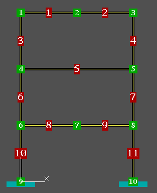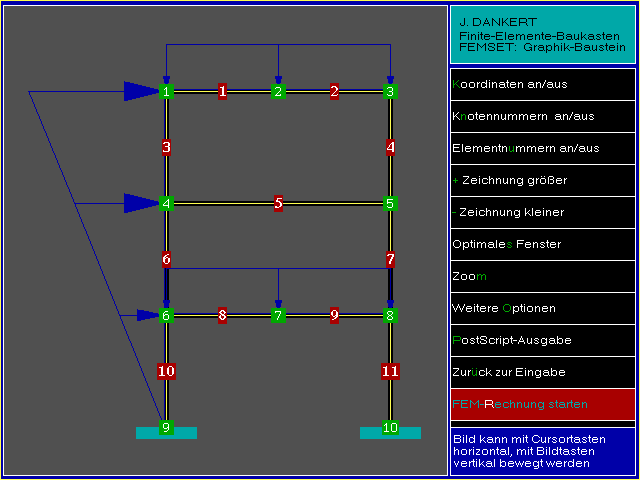 Das Rahmentragwerk wird entsprechend nebenstehender Skizze in NE=11 Elemente zerlegt, was auf NK=10 Knoten führt, Elemente und Knoten werden wie skizziert (willkürlich) nummeriert