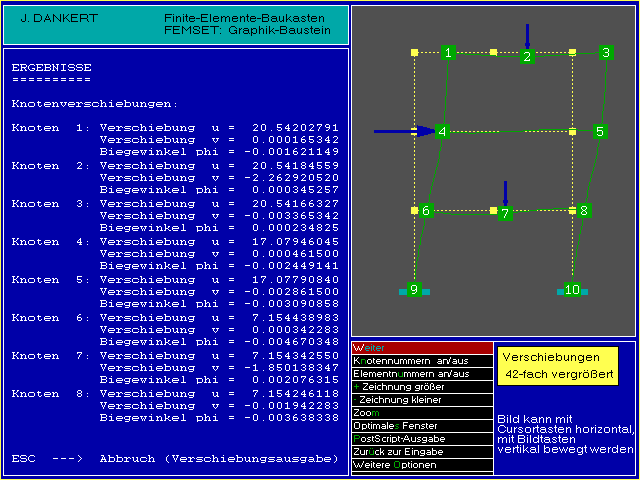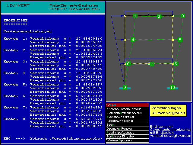Nach Wahl von “FEM-Rechnung” starten werden die Verformungen berechnet und nach Drücken einer beliebigen Taste als Liste und Graphik angezeigt: