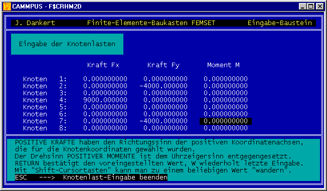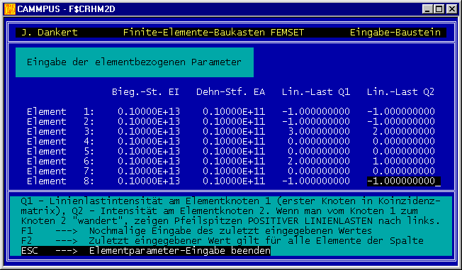 Im Eingabe/Korrektur-Menü wird zunächst “Eingabe: Element-Parameter” gewählt und alle Linienlast-Intenitäten werden Null gesetzt. Mit ESC landet man wieder im